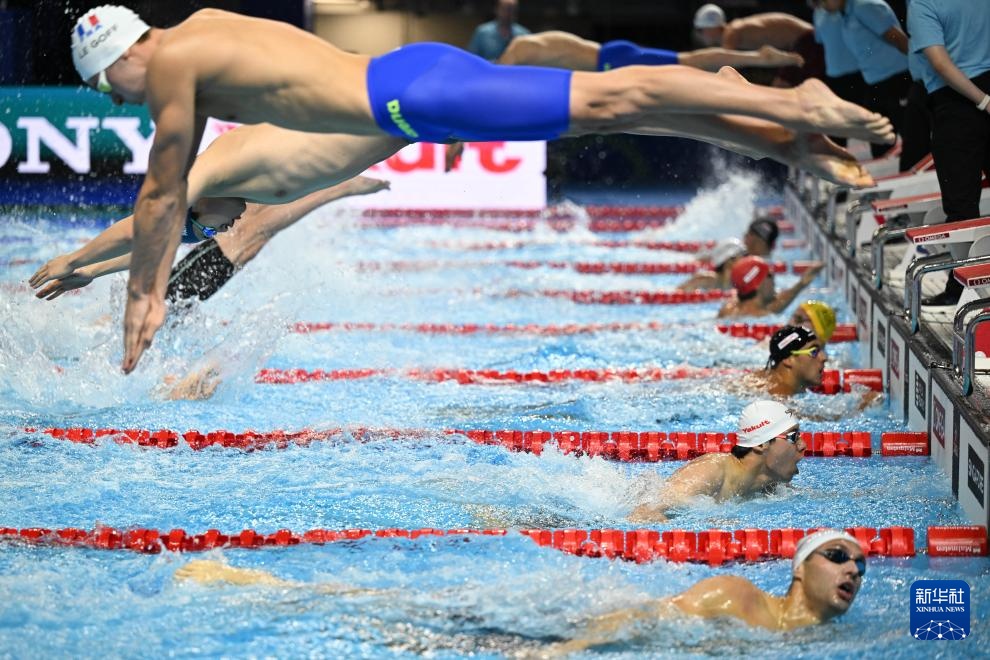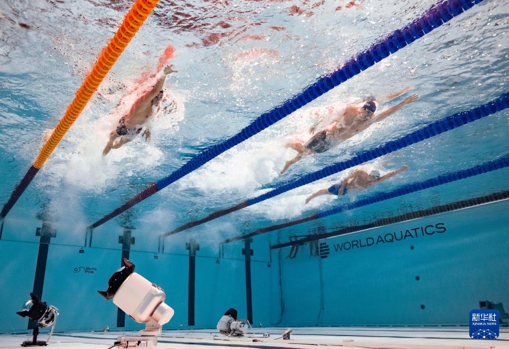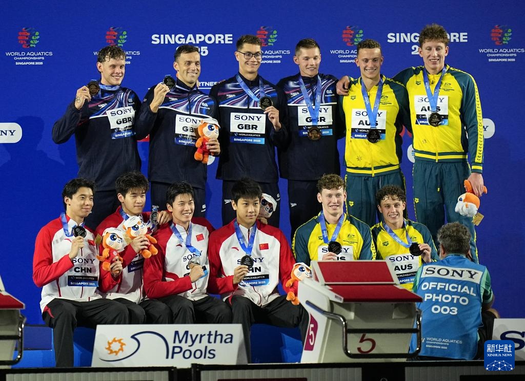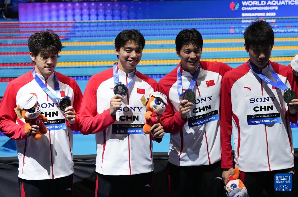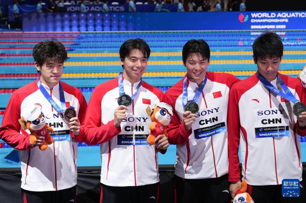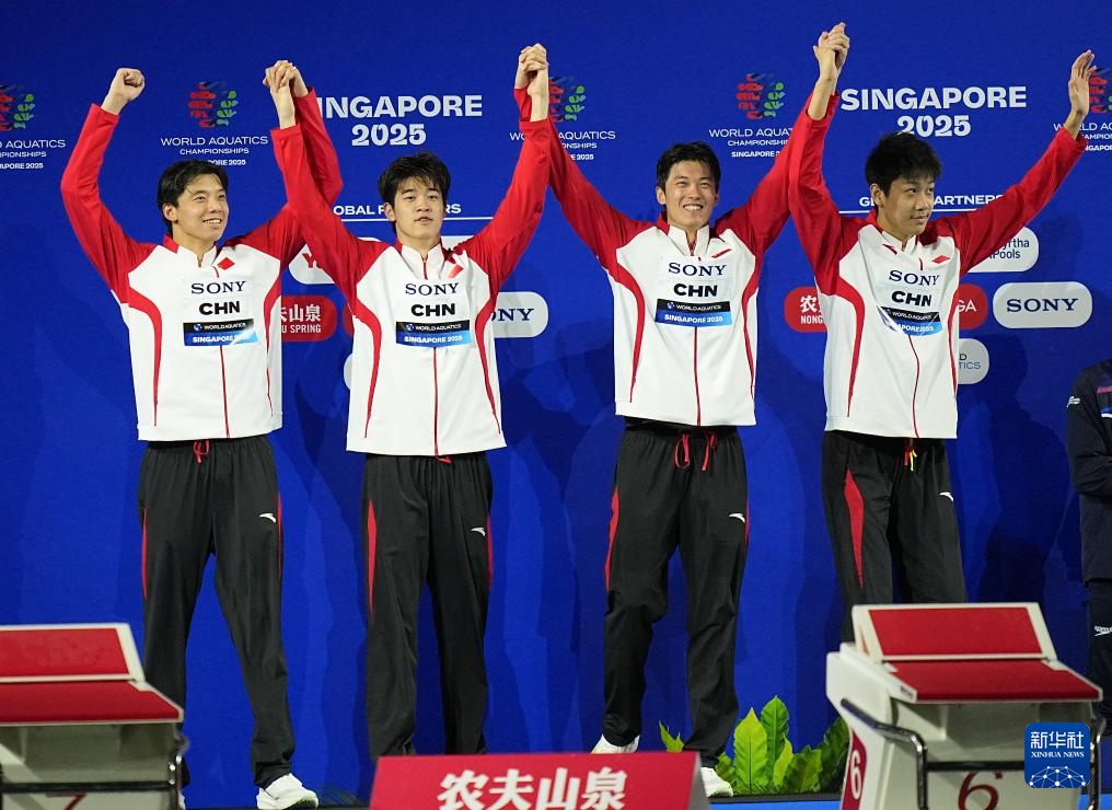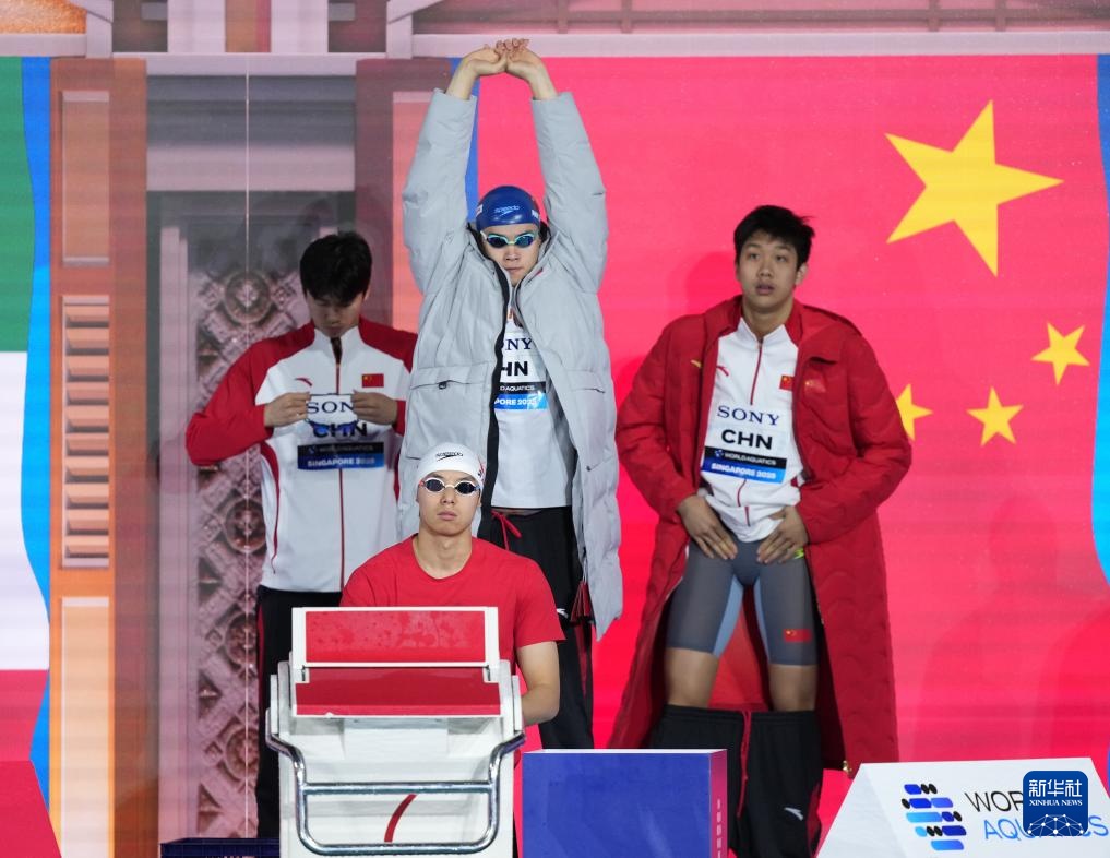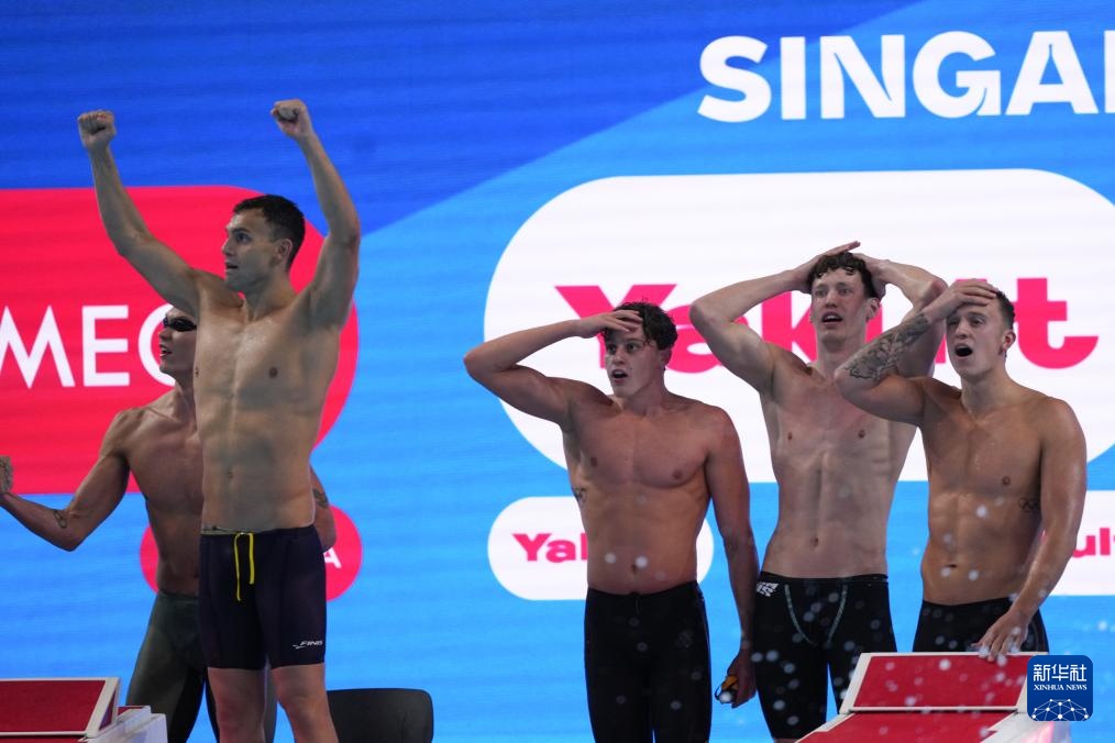 当日,2025年世界游泳锦标赛游泳男子4X200米自由泳接力决赛在新加坡举行。
