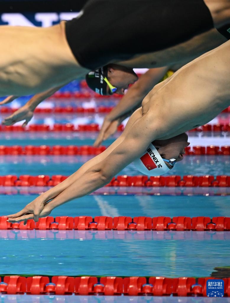 8月1日,中国队第一棒选手季新杰(左)在比赛中。最终由季新杰、潘展乐、汪顺、张展硕组成的中国队获得亚军。
