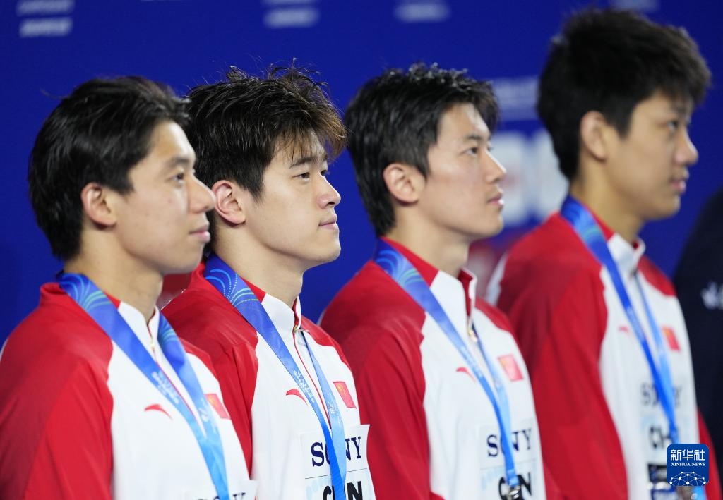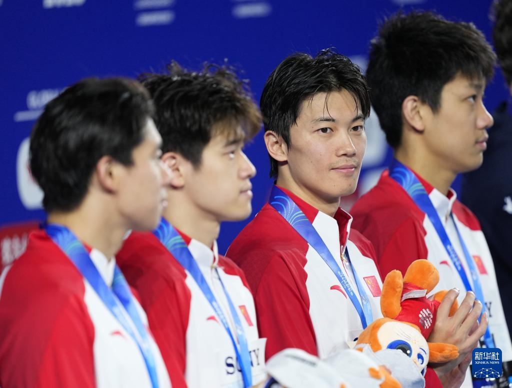 8月1日,亚军由季新杰、潘展乐、汪顺、张展硕(从左至右)组成的中国队在颁奖仪式上。