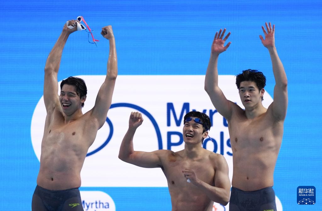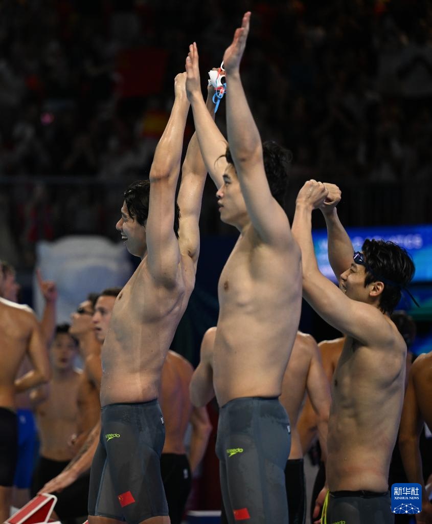 8月1日,中国队选手季新杰、汪顺、潘展乐在比赛后庆祝。最终,中国队获得亚军。