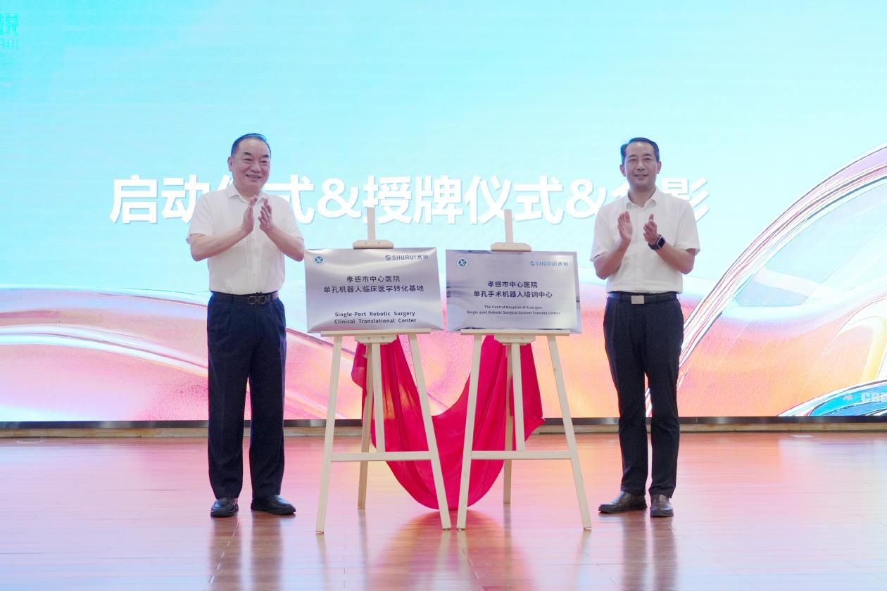 随后,进行了孝感市中心医院单孔手术机器人培训中心及单孔机器人临床医学转化基地揭牌。培训中心的落成,标志着术锐单孔手术机器人在探索技术与实践结合的道路上又成功开拓了一块崭新标地。