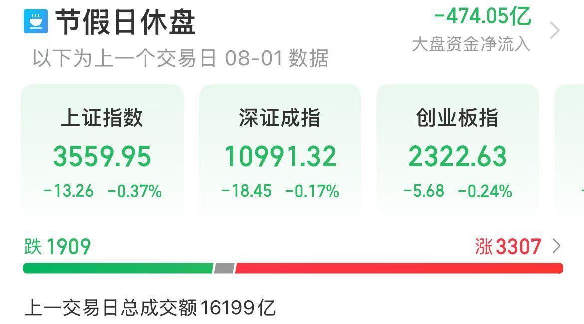 8月1日,A股总体呈弱势整理的态势,上证、深证、创业板等三大指数均止步于周线“五连阳”。截至收盘,沪指跌0.37%,深成指跌0.17%,创业板指跌0.24%。沪深两市全天成交额1.60万亿,较上个交易日缩量3377亿。盘面上市场热点快速轮动,全市场虽有超3307家个股上涨,但整体赚钱效应一般。