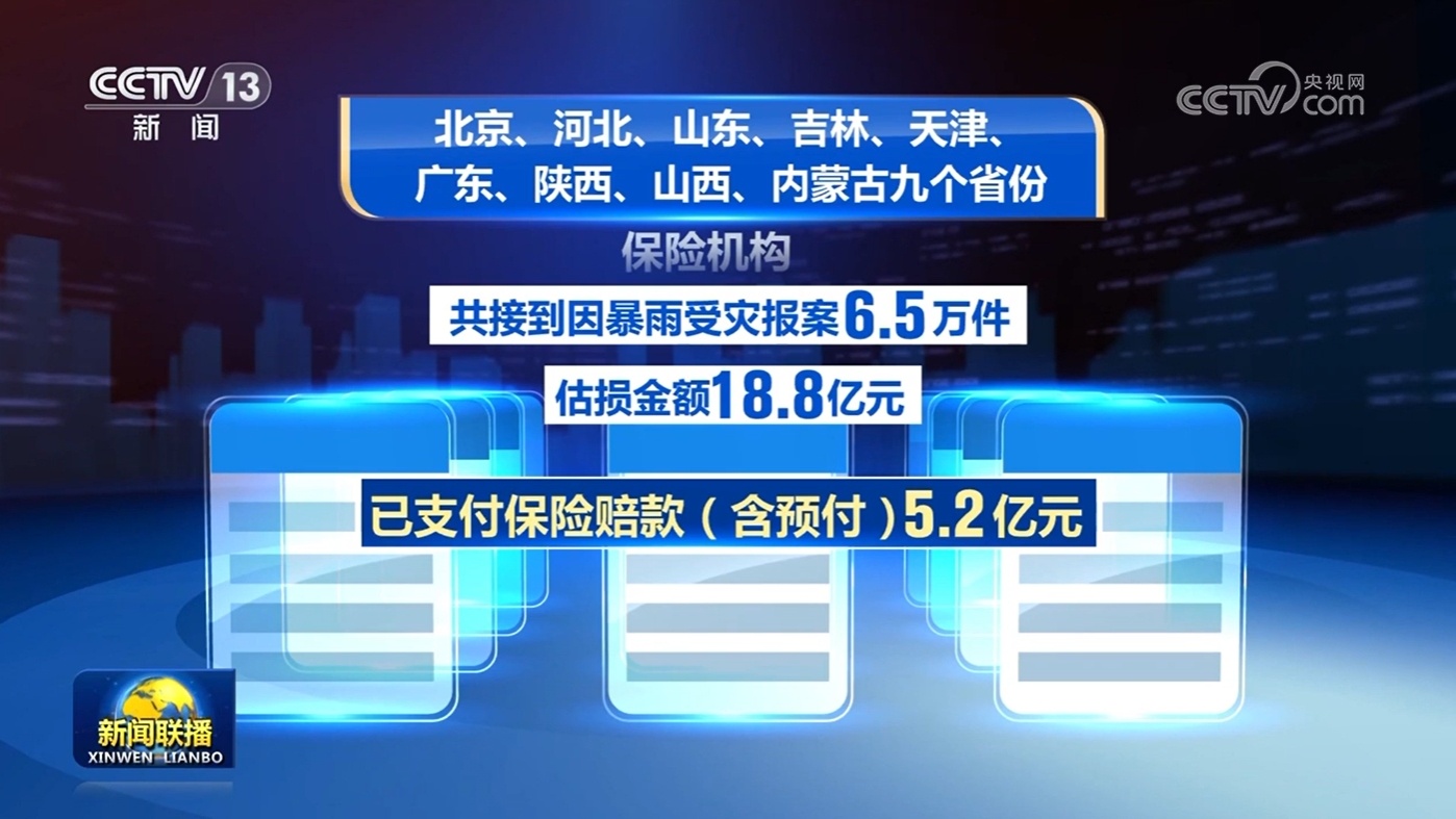 据金融监管总局初步统计,目前北京、河北、山东、吉林、天津、广东、陕西、山西、内蒙古九个省份,保险机构共接到因暴雨受灾报案6.5万件,估损金额18.8亿元,已支付保险赔款(含预付)5.2亿元。