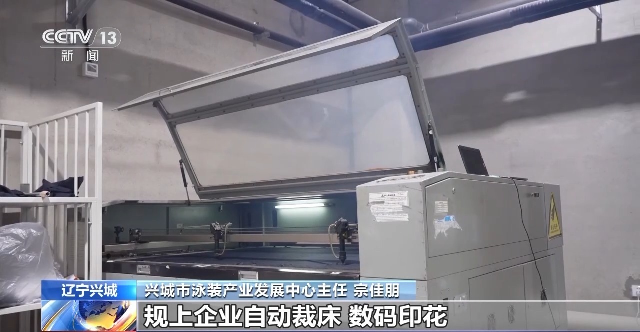 兴城市泳装产业发展中心主任 宗佳朋:目前兴城泳装的智能化转型趋势非常明显,我们全市33000多台的生产设备中,有30%以上采用了国际先进的生产设备,规上企业自动裁床,数码印花、自动铺布等设备的使用率,已经达到90%以上。