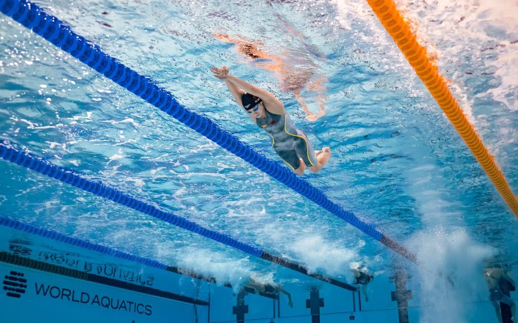 7月27日,中国队第三棒选手余依婷在比赛中。当日,2025年世界游泳锦标赛游泳女子4X100米自由泳接力决赛在新加坡举行。新华社记者 伍志尊 摄