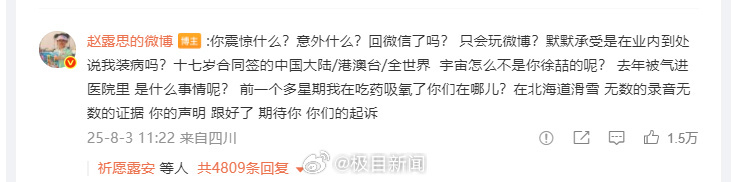 8月2日,赵露思发布微博@银河酷娱传媒,相关话题冲上热搜,并提到:剧组解散了就是结果?全跑了就是结果?最后我来赔钱就是结果?跟我说我可能要被封杀最近不要有任何动态,就是解决吗?8月3日上午,@银河酷娱传媒 发布声明回应后,赵露思再回应:你震惊什么?意外什么?回微信了吗? 只会玩微博?默默承受是在业内到处说我装病吗?宇宙怎么不是你徐喆的呢? 去年被气进医院里 是什么事情呢? 前一个多星期我在吃药吸氧了你们在哪儿?