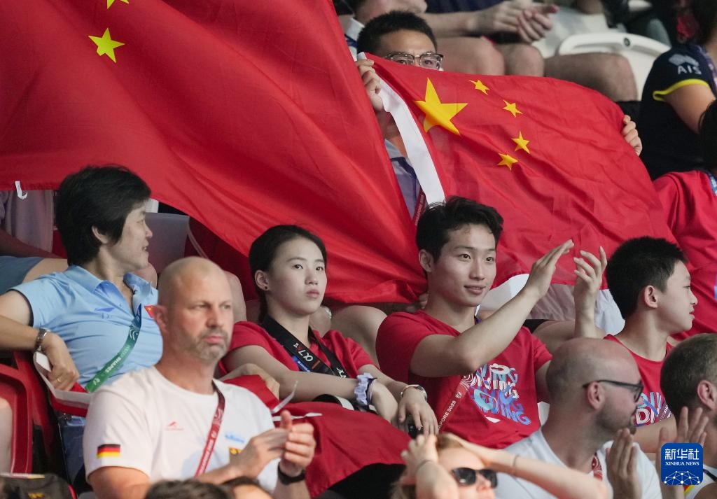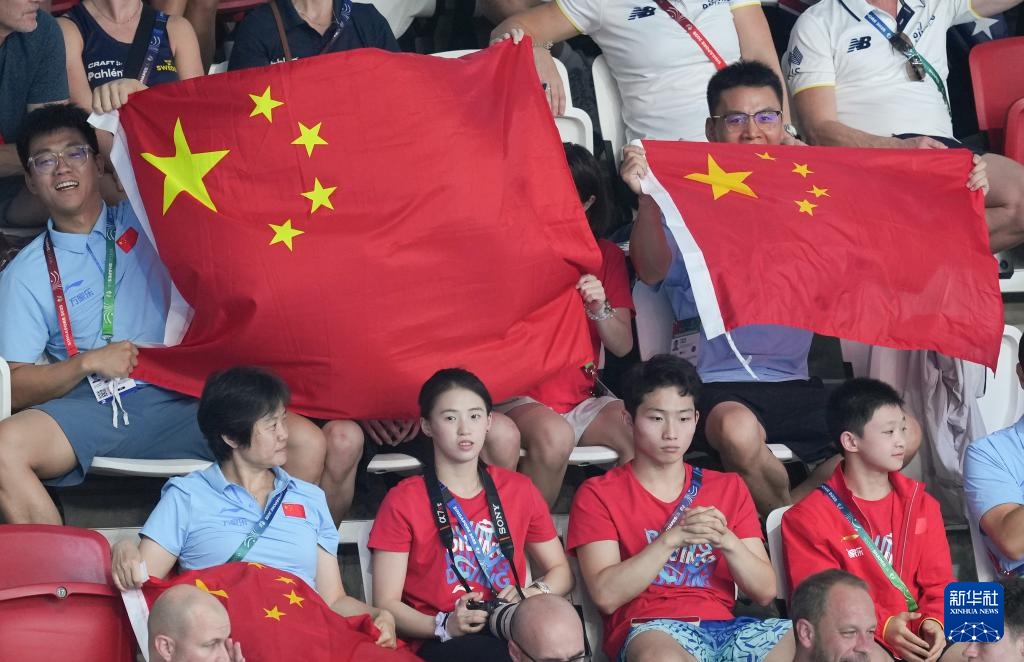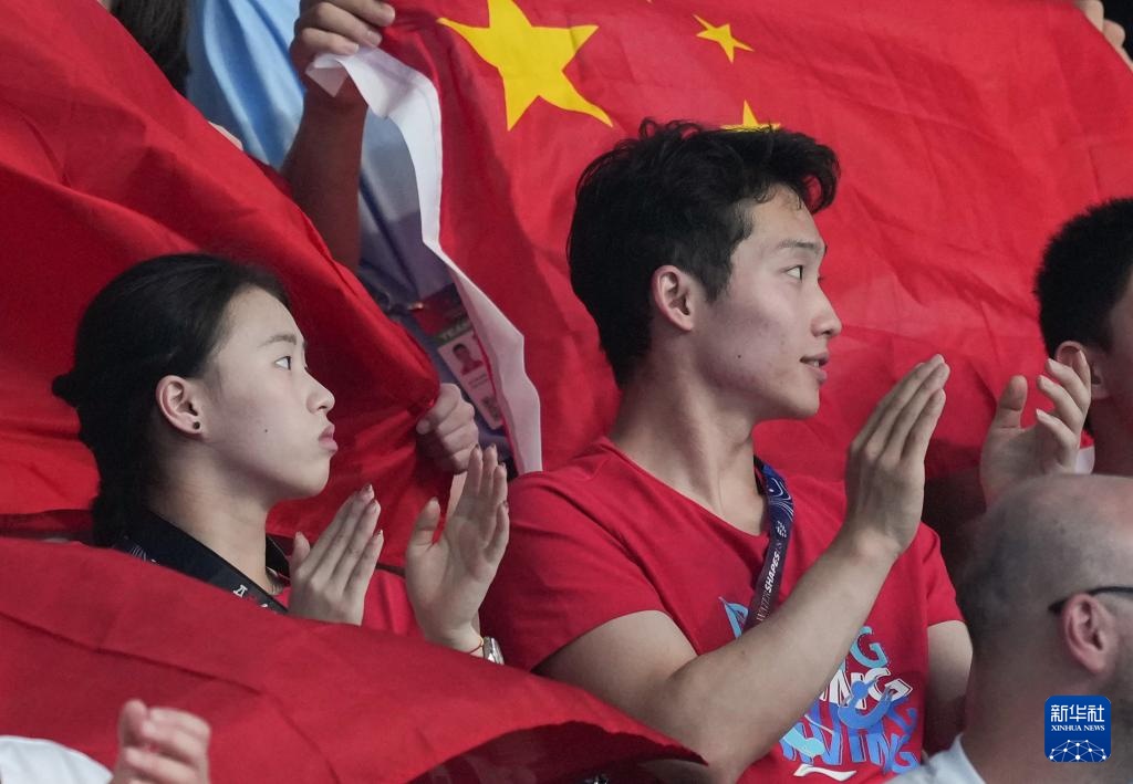 8月2日,中国选手陈芋汐(下左二)、王宗源(下右二)在观众席观赛。