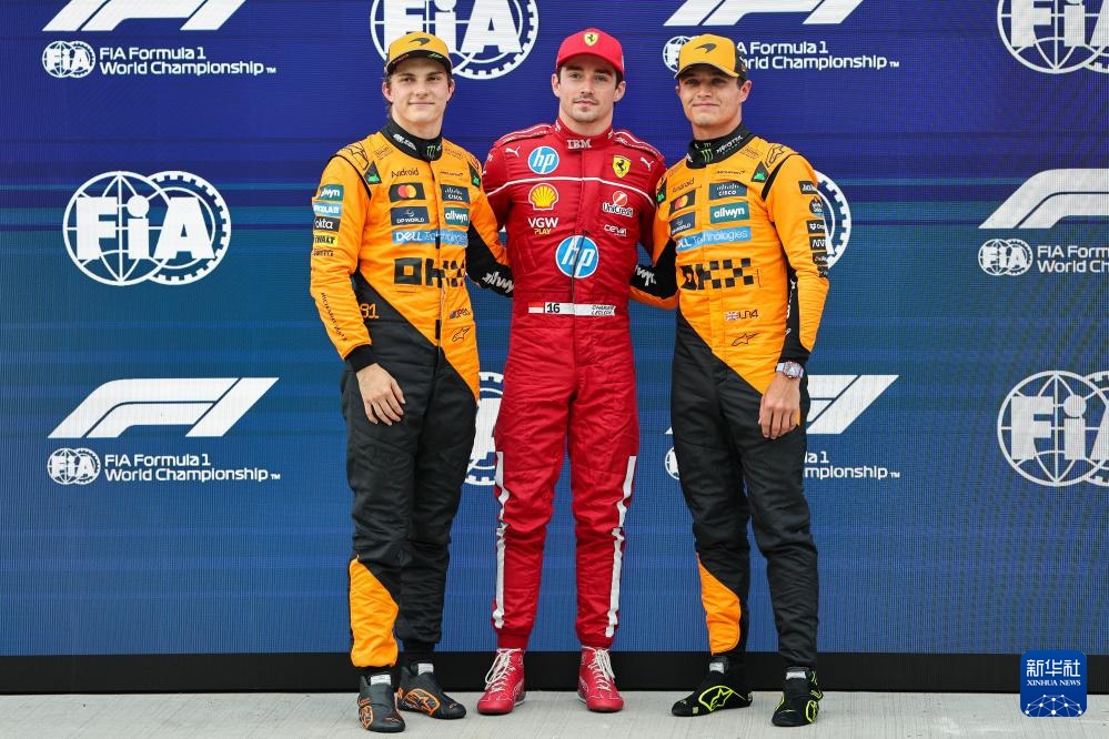 8月2日,获得杆位的法拉利车队摩纳哥车手勒克莱尔(中)、第二名迈凯伦车队澳大利亚车手皮亚斯特里(左)、第三名迈凯伦车队英国车手诺里斯在赛后合影。
