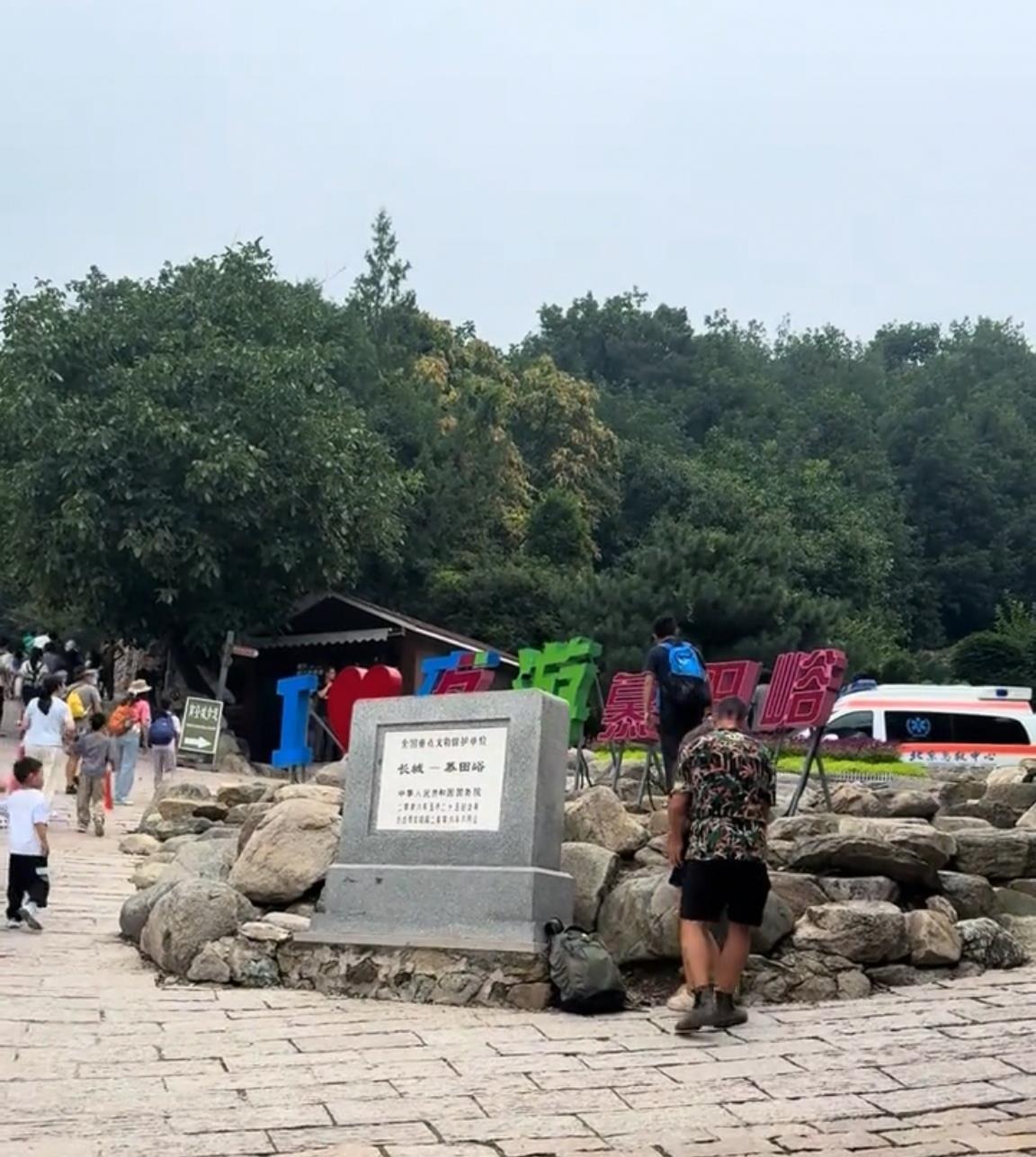 上述图片显示,一名背着双肩包的男子躺在台阶上。视频显示,有游客脱掉上衣,还有游客在哭泣。一辆120急救车驶过“长城-慕田峪”石碑旁,附近还有大量游客。