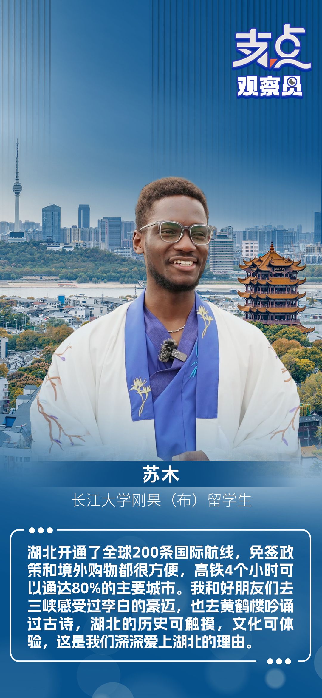 长江大学刚果(布)留学生苏木身着战国袍向记者展示时说道:“在我看来,战国袍应该是挺正式的,我感觉这就是古代的西服。来荆州不过来看古城墙那真遗憾,一定要过来然后多多地了解荆州的文化和历史。”