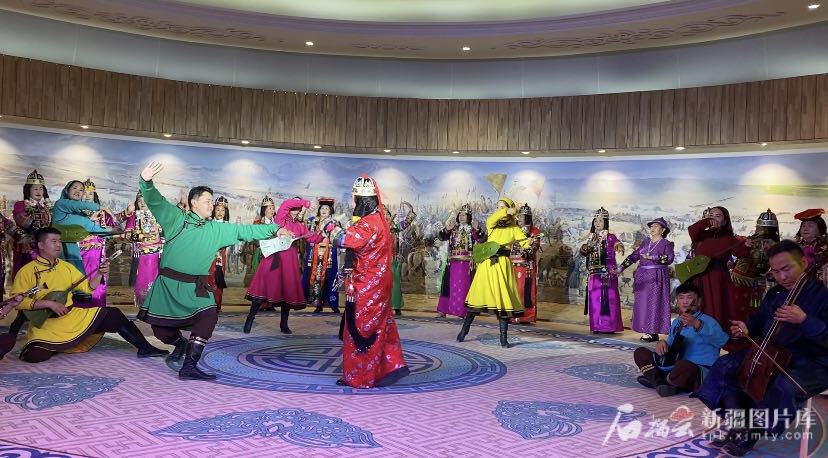 在博湖县蒙古族非物质文化遗产传承保护中心,表演者身着华丽民族服饰,伴着欢快的节奏起舞,抖肩、弯腰、翻掌等动作尽显萨吾尔登舞蹈的魅力,吸引现场观众纷纷拍照。悠扬的蒙古长调、铿锵的《江格尔》史诗、古朴的托布秀尔琴音、饱含祝福的祝赞辞……精彩的非遗展演让观众领略传统文化魅力的同时,也仿佛听见了草原的辽阔与豪迈。