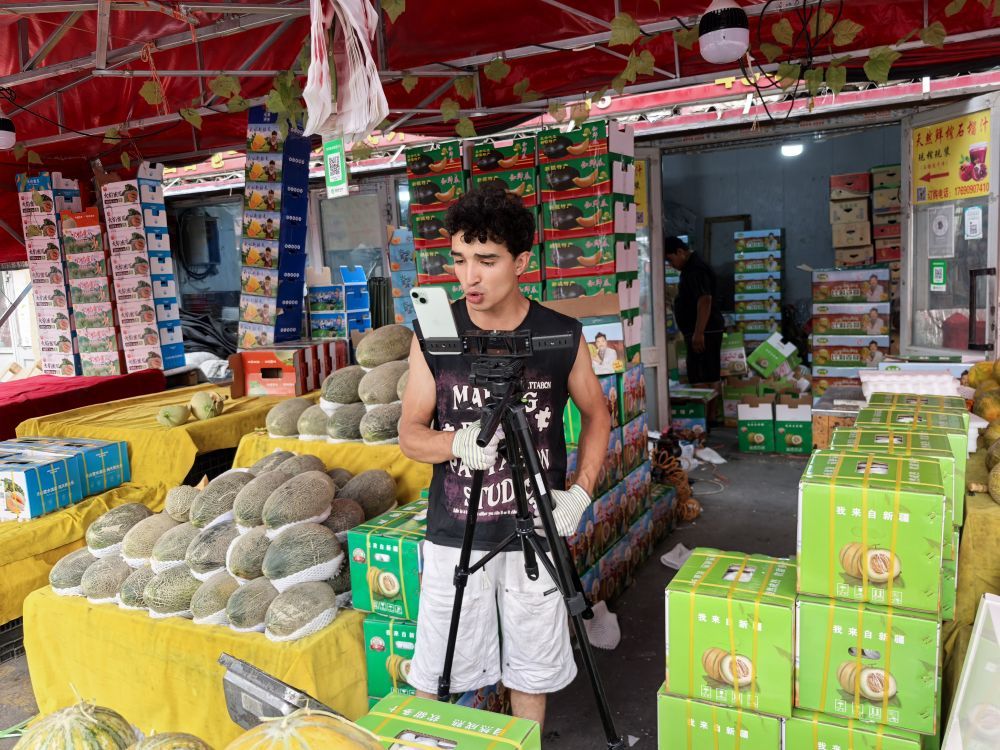 7月29日,新疆一家水果商户直播销售老汉瓜。新华社记者苟立锋 摄