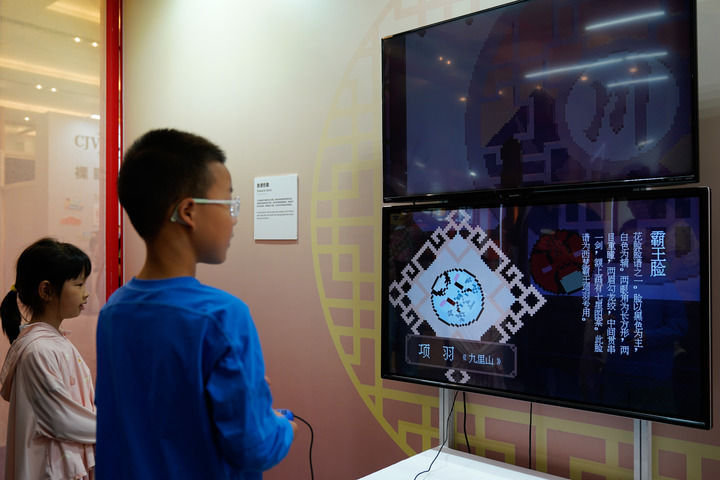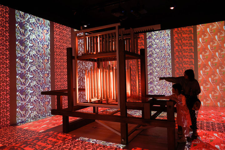 ↑2025年5月31日,在第九届中国成都国际非物质文化遗产节上,参观者通过光影装置了解蜀锦织机工作原理。