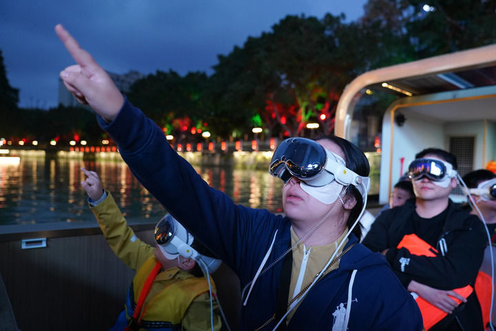 ↑2024年10月4日,在四川省成都市,游客在数字游船上通过MR(混合现实)眼镜游览锦江。