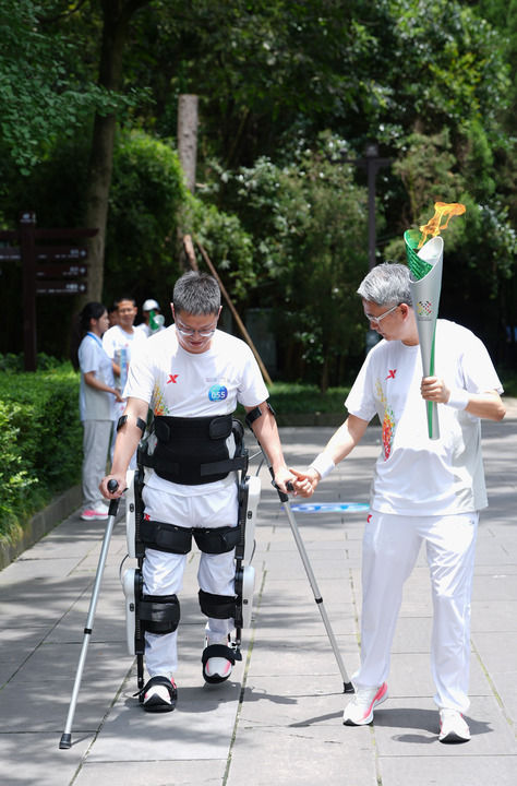 火炬传递活动中“外骨骼机器人”装备助力残疾人火炬手