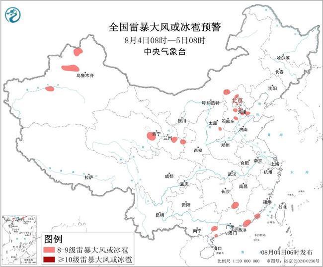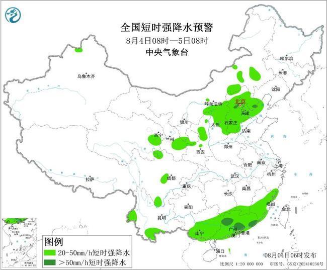 预计8月4日8时至5日8时,西北地区中东部、华北中北部、华南南部等地的部分地区将有8级以上雷暴大风或冰雹天气;西北地区中东部、华北、江南南部和东部、华南中东部等地的部分地区将有小时雨量大于20毫米的短时强降水天气,其中,河北中部和东北部、北京西南部、广东西北部和中南部等地的部分地区小时雨量大于50毫米,最大可达80毫米以上。