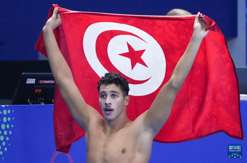 8月3日,突尼斯选手贾瓦迪在比赛后庆祝。最终,他获得冠军。