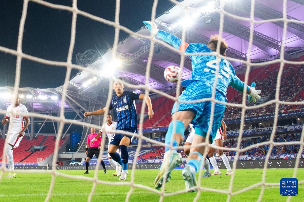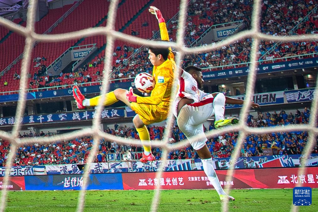 8月3日,武汉三镇队守门员郭嘉宇(左)在比赛中扑救险球。