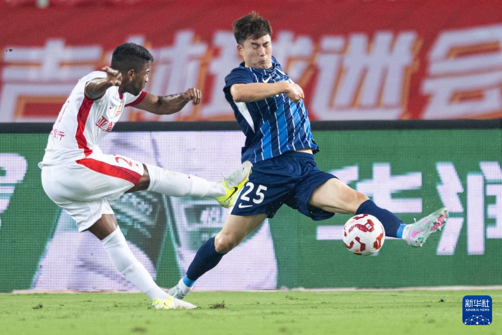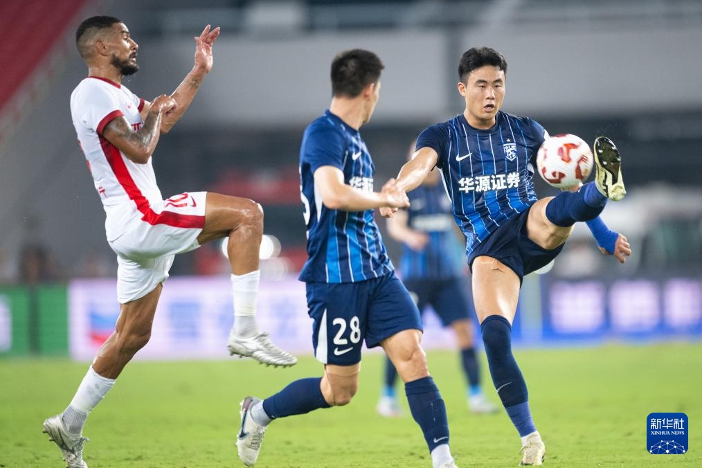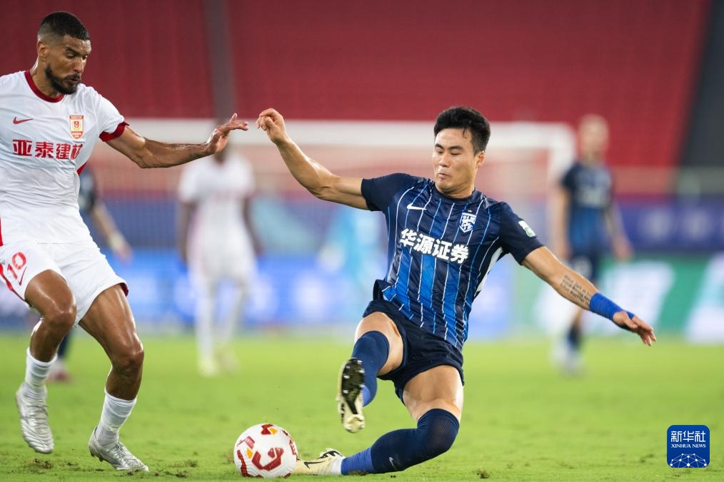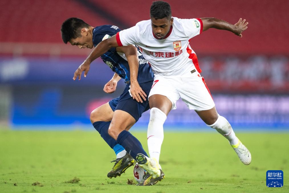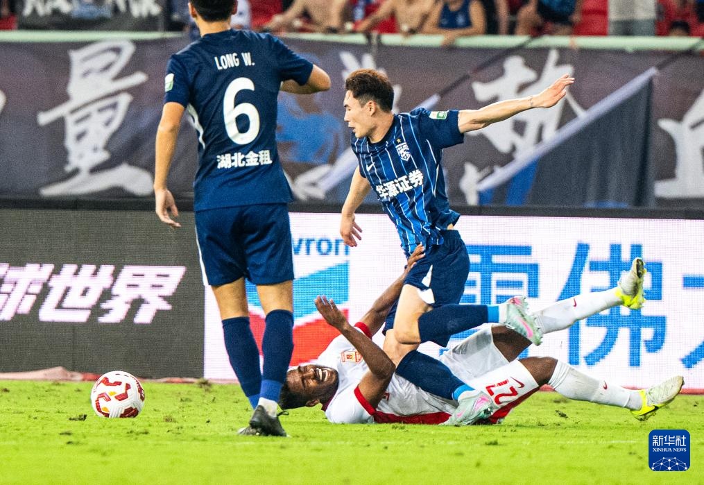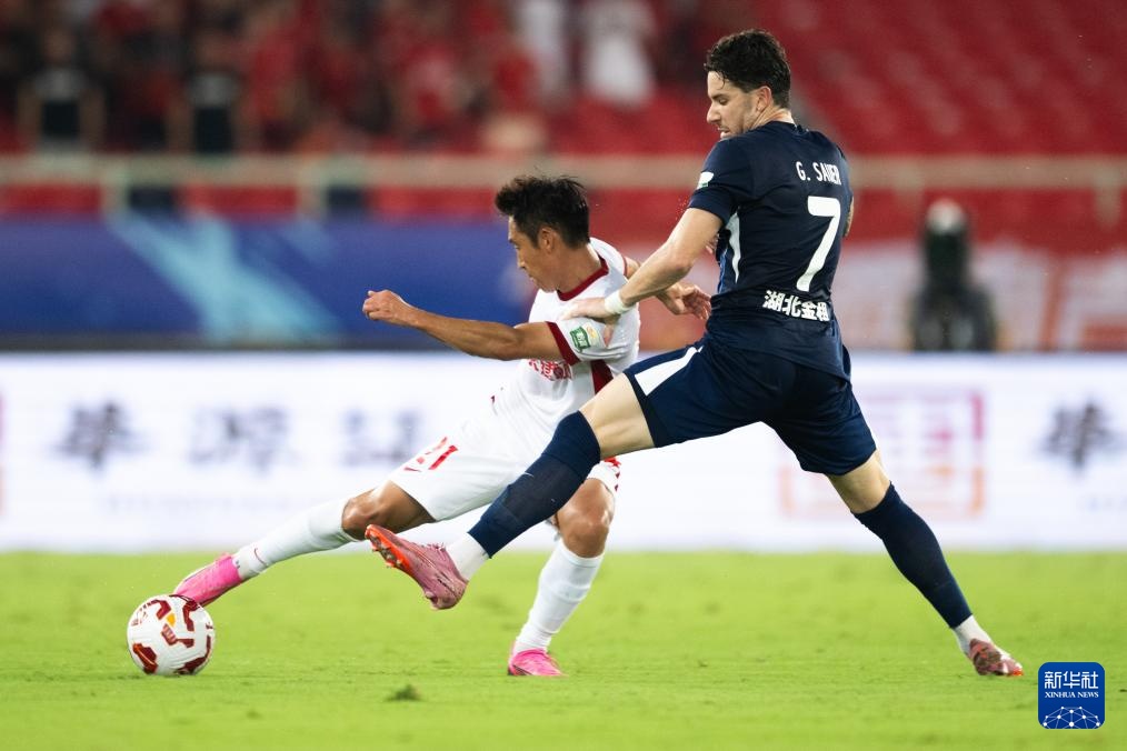 8月3日,武汉三镇队球员郑浩乾(左)在比赛中与长春亚泰队球员胡安·卡米洛拼抢。