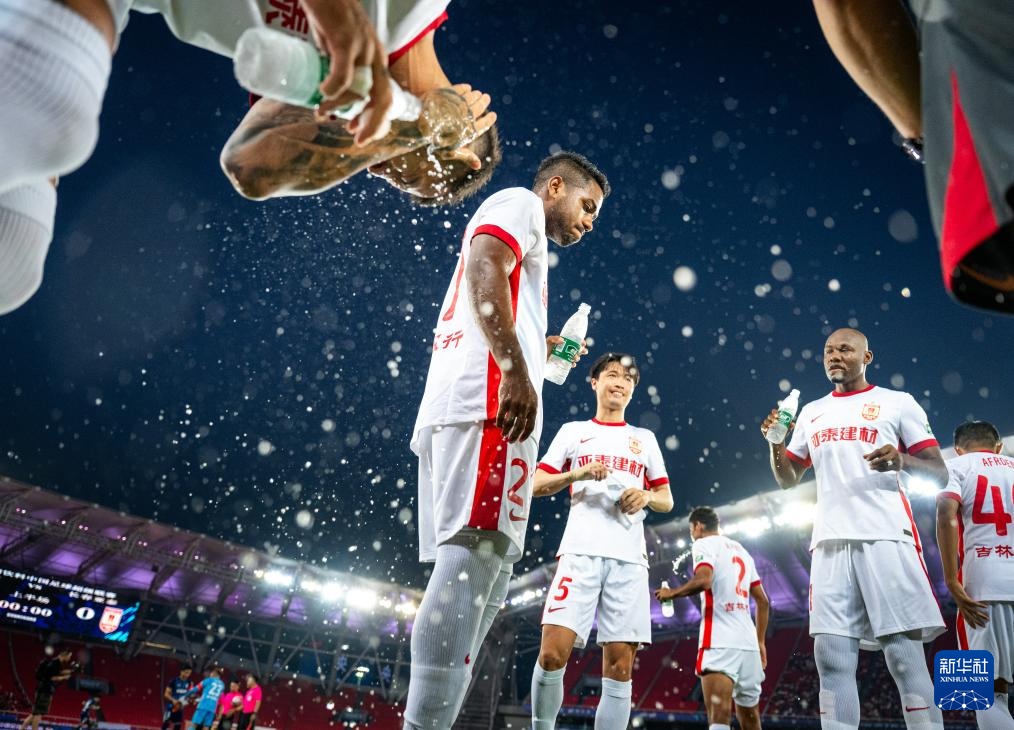 8月3日,长春亚泰队球员胡安·卡米洛(左二)在比赛前补水。