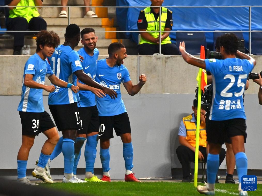 8月3日,大连英博海发队球员马莱莱(右一)主罚点球命中后庆祝。
