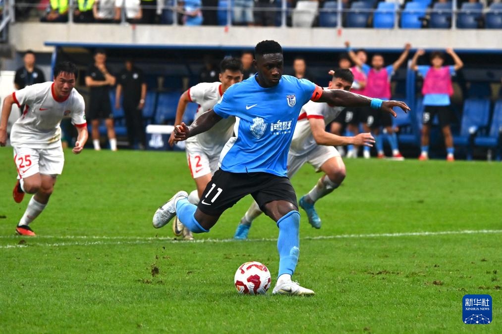 8月3日,大连英博海发队球员马莱莱(前)主罚点球命中。