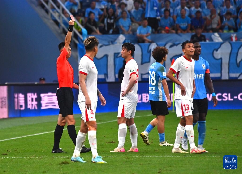 8月3日,主裁判甄伟向青岛海牛队球员张弛(右二)出示红牌。