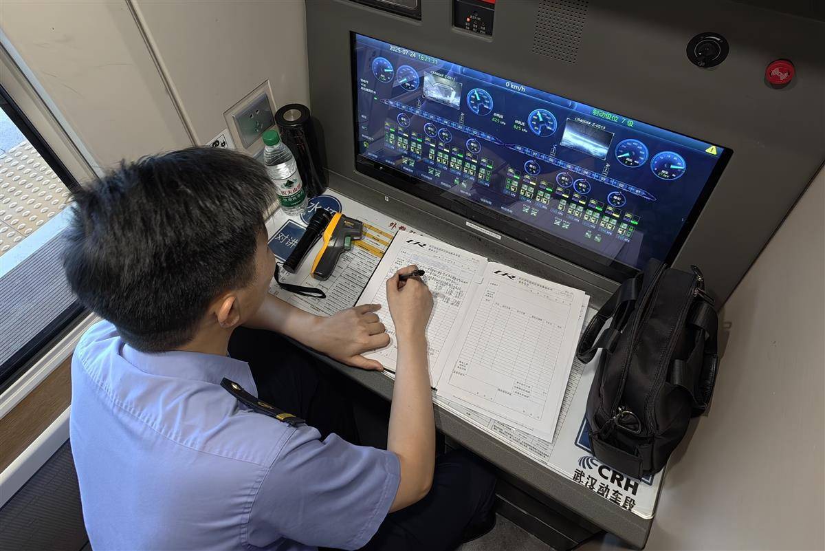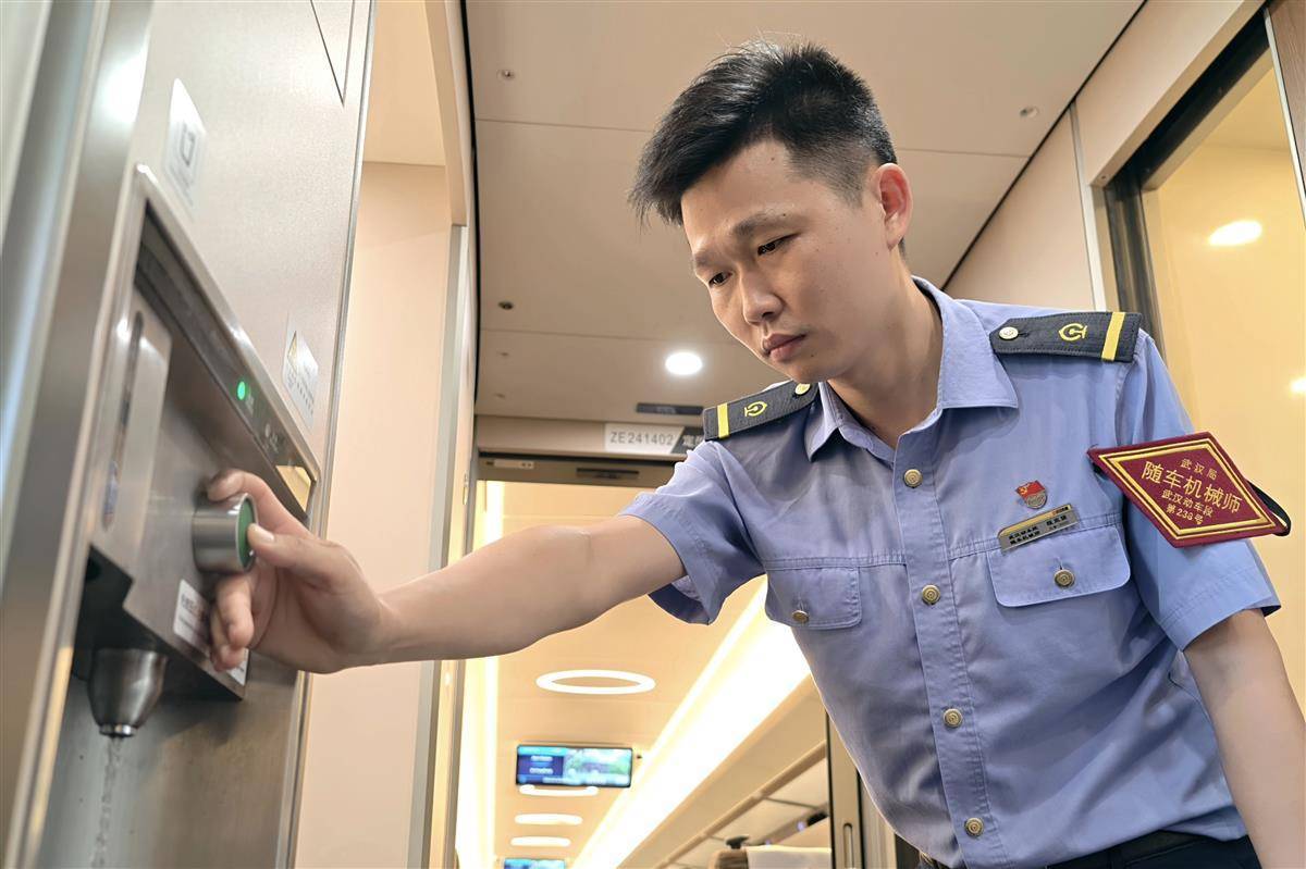 暑运期间,武汉持续高温天气,武汉铁路局武汉动车段的随车机械师程双强对车内的照明系统、空调机组、车门设施等进行细致入微的检查,以确保各项设备都能正常工作。在这炎炎夏日里,高铁设备的稳定运行对于保障乘客的舒适体验至关重要,随车机械师们用自己的坚守与付出,为乘客驱散了酷热,带来了清凉与安心,确保了安全、舒适的乘车环境。(湖北日报全媒记者 陈少哲 通讯员 汤克威 摄)