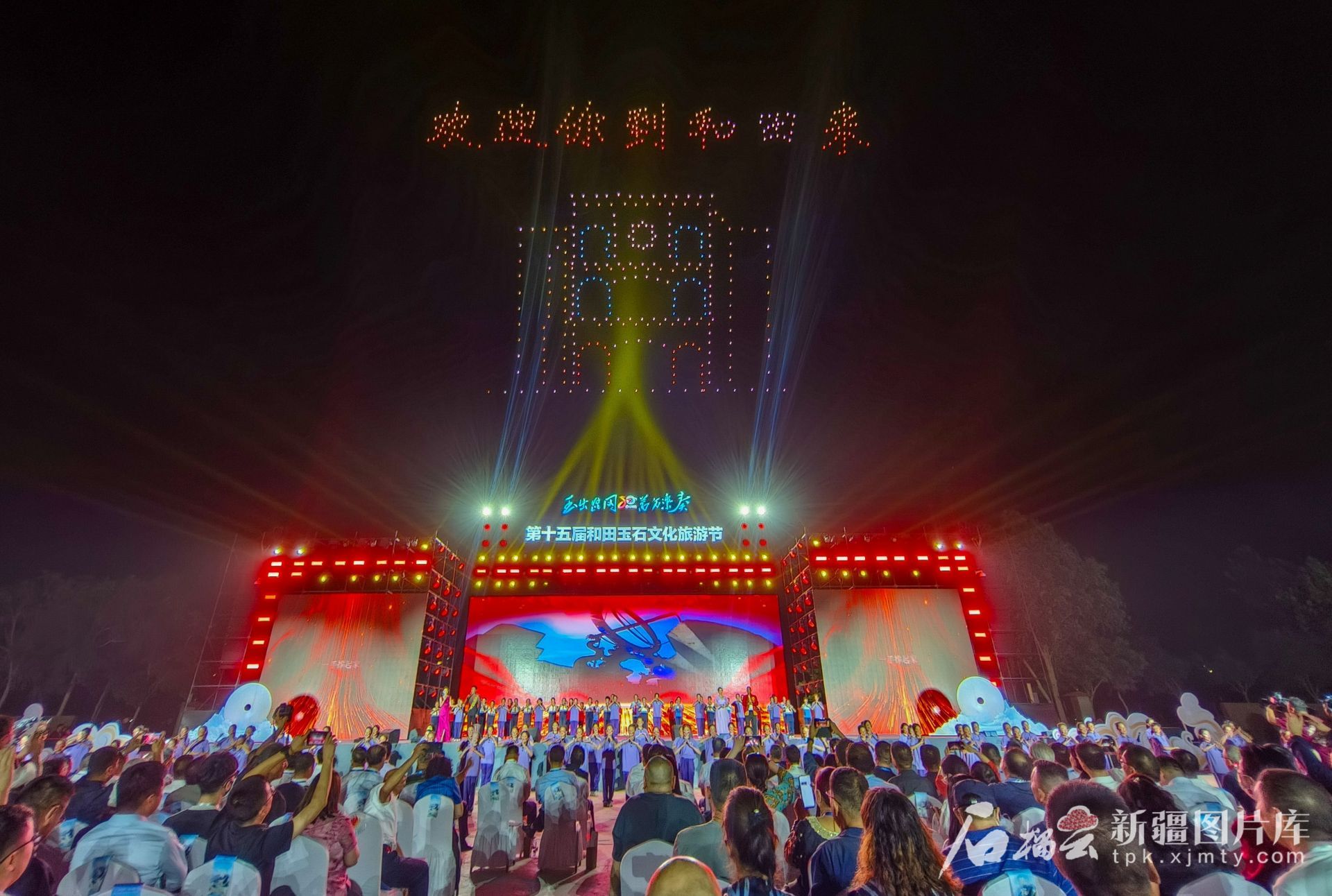 千架无人机点亮和田夜空为玉石文化旅游节添彩。 许晓龙摄