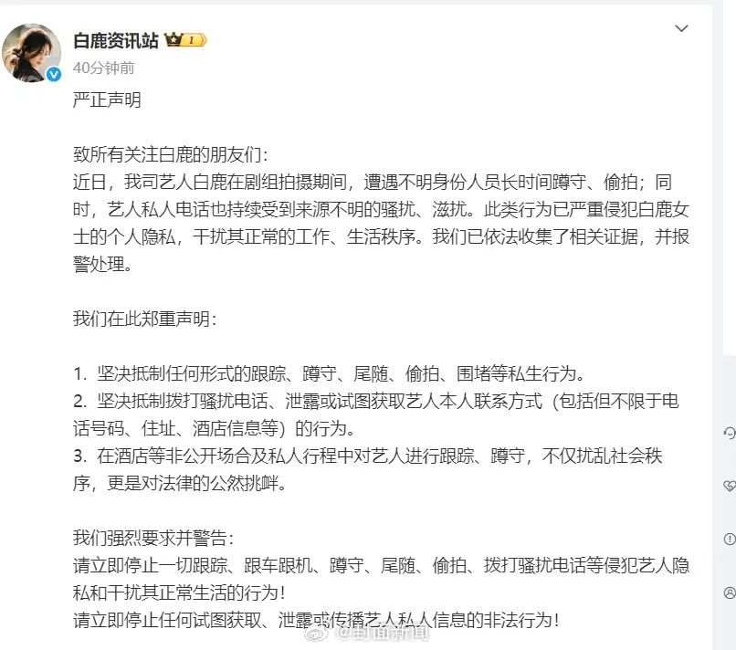 8月4日,@白鹿资讯站 发布声明:近日,我司艺人白鹿在剧组拍摄期间,遭遇不明身份人员长时间蹲守、偷拍;同时,艺人私人电话也持续受到来源不明的骚扰、滋扰。此类行为已严重侵犯白鹿女士的个人隐私,干扰其正常的工作、生活秩序。我们已依法收集了相关证据,并报警处理。