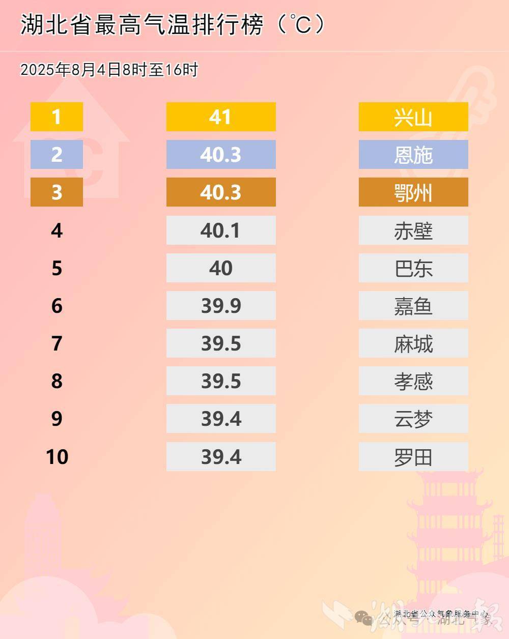4日,天气依旧是晴热+阵雨,白天宜昌、荆州、黄冈、黄石、咸宁等地出现分散性阵雨或雷阵雨。随着副热带高压与大陆高压连通,高温也愈演愈烈。截至16时除竹山、神农架和利川外,省内其他地区都出现了35℃以上的高温天气,近六成县市区最高气温超过38℃,兴山、鄂州、恩施、赤壁、巴东达40℃及以上。预计6日至7日鄂北地区有中雨到大雨,十堰、襄阳、随州等局地暴雨。9日晚至11日,大部地区有中雨到大雨,局地暴雨,单点大暴雨。10日起,湖北大部地区高温将“退场”。