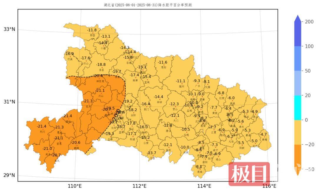 湖北省各县市2025年8月降水距平百分率预测图(%)