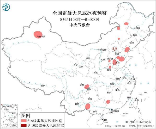 预计8月5日8时至6日8时,新疆西部、内蒙古东部、东北地区南部、华北南部、华中北部、华东北部、西南地区北部、华南西部和北部等地的部分地区将有8级以上雷暴大风或冰雹天气;新疆西部、内蒙古东部、东北地区西部、华北南部、西北地区南部、西南地区中东部、华中北部和南部、华东北部和东南部、华南等地的部分地区将有小时雨量大于20毫米的短时强降水天气,其中,山东中北部、广西东部、广东中部等地的部分地区小时雨量大于50毫米,最大可达80毫米以上。