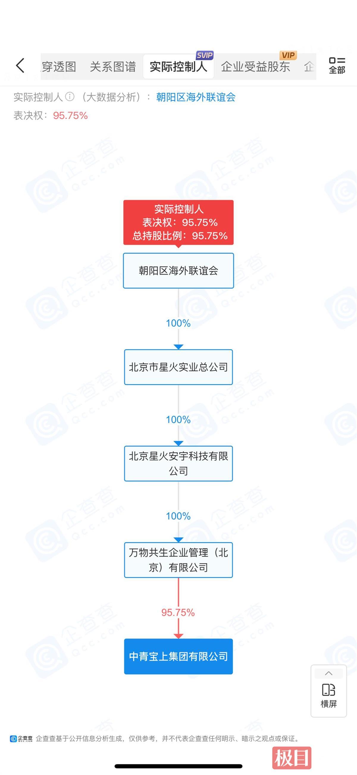 企查查股权穿透图谱显示,中青宝上集团有限公司是由北京市星火实业公司实际控制的公司,北京市星火实业公司为一家全民所制类型的国有企业。