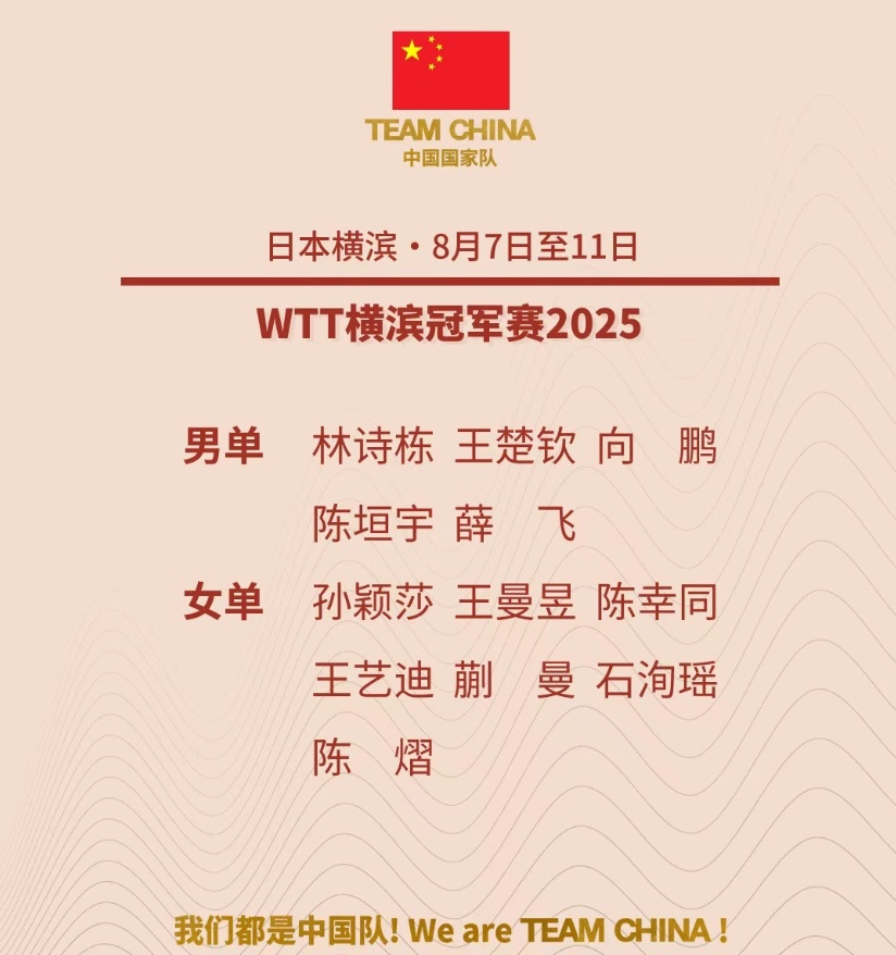 WTT世界乒联横滨冠军赛2025将于8月7日至8月11日在日本横滨文化体育馆举行。冠军将获得1000点世界排名积分。
