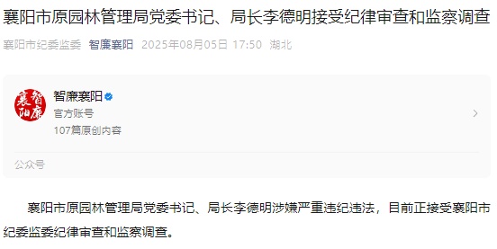 襄阳市原园林管理局党委书记、局长李德明涉嫌严重违纪违法,目前正接受襄阳市纪委监委纪律审查和监察调查。