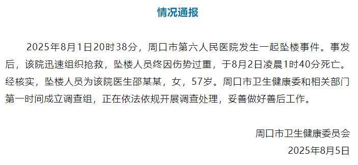 8月5日,河南省周口市卫生健康委员会发布情况通报称,2025年8月1日20时38分,周口市第六人民医院发生一起坠楼事件。事发后,该院迅速组织抢救,坠楼人员终因伤势过重,于8月2日凌晨1时40分死亡。经核实,坠楼人员为该院医生邵某某,女,57岁。周口市卫生健康委和相关部门第一时间成立调查组,正在依法依规开展调查处理,妥善做好善后工作。