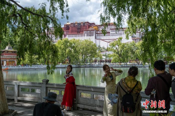 7月29日,游客在布达拉宫广场东侧人工湖附近“打卡”。中新社记者 江飞波 摄