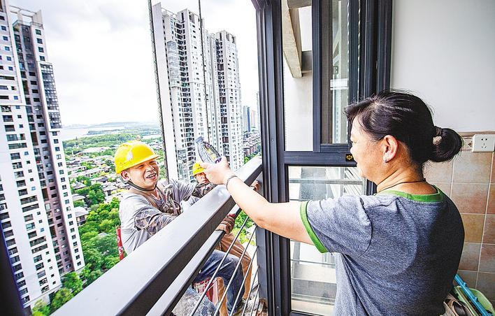 7月27日,32楼的外墙渗水处理好后,业主文女士感激地给李康明和杨文递矿泉水。