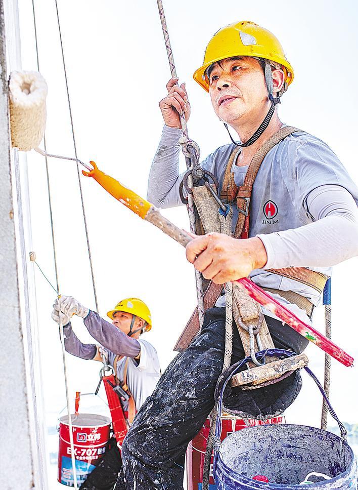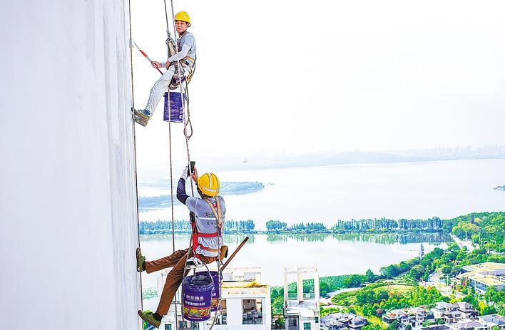 早上7时他们就开工了。经理张祖平一起抵达,负责现场安全监督,并与业主沟通。住宅楼高43层,杨文和李康明从楼顶吊下安全绳,戴上安全帽,系好安全滑板、安全护垫,扣上安全扣和安全锁,然后挂上两只桶,一个装涂料,一个装腻子,攀着安全绳缓缓下降。
