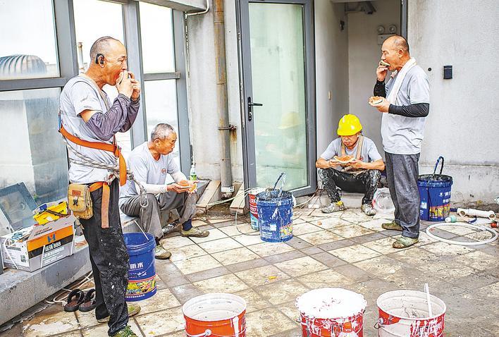 8月1日,杨文(左)和工友在施工间隙吃西瓜消暑。