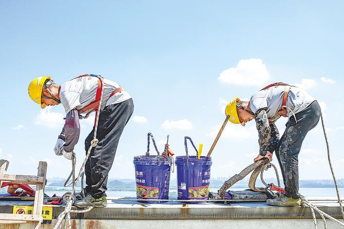 14时许,湖北和年美建筑工程有限公司的“蜘蛛人”杨文、李康明正在对东湖边的一栋超高层住宅楼外立面进行美化施工,灼热的阳光透过玻璃面投射,他俩施工时频频被烫到。