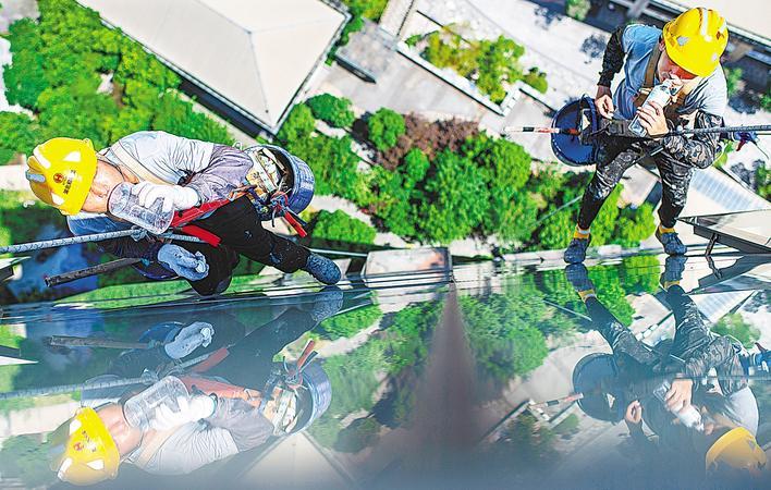 “蜘蛛人”主要从事外墙清洗、修复和防水工作,活谈不上太累,但确实不是一般人能做的。他们必须有强大的心理素质、一丝不苟的工作态度,并取得国家特种作业操作证,才能上岗作业。