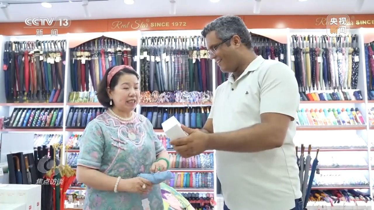 张吉英是义乌小商品市场的一位伞具经营户。今年,她店铺里一款经过创新设计的防晒伞,在国外掀起了一股流行风潮,与国内消费者追求防晒伞小巧轻便不同,国外客户更偏爱大尺寸款式。比如在中东地区,人们喜欢雨伞里面能喷水雾的款式,以追求更好的降温体验。