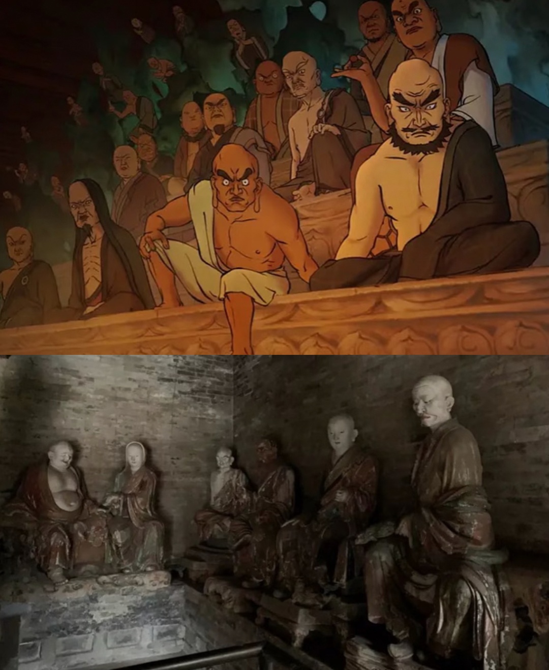 他还在众多雕塑、壁画中寻找灵感,将其临摹下来,于是大银幕上有了栩栩如生的壁画,有了让人望而生畏的罗汉……