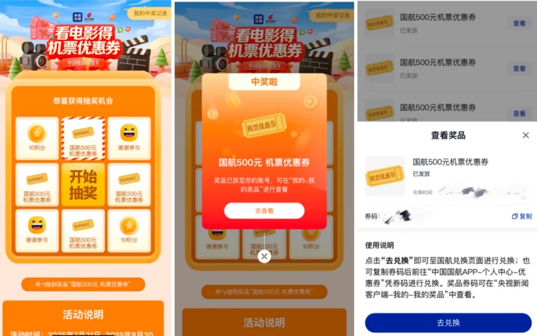 即日起至8月20日,在央视新闻客户端,选择“我的”页面,点击“看电影得机票优惠券”进入活动。到猫眼或淘票票购买电影票,即可获得在央视新闻客户端抽奖机会,赢国航500元机票优惠券。每日每个账号限参与一次抽奖。