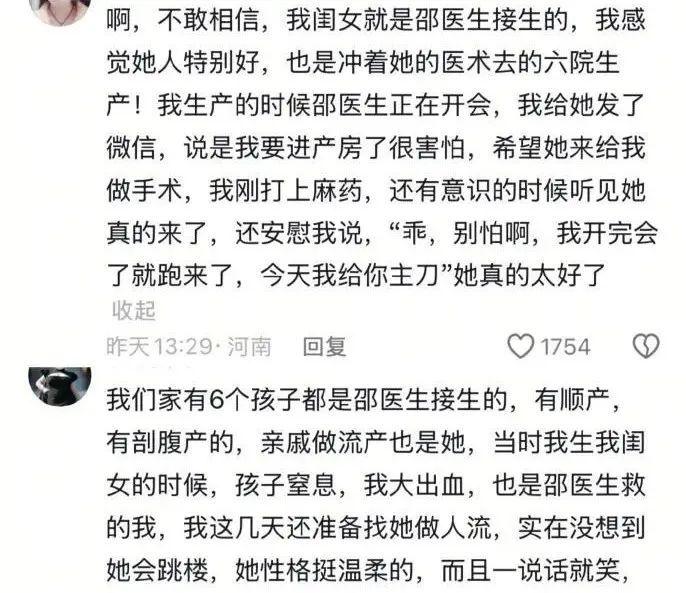 “我就是她曾经接诊的一位产妇,她对待产妇温柔细心!”IP地址为河南的网友“童心静心”告诉记者,她曾经和邵医生接触过,2016年时自己找她产检,9年前过去了,对邵医生依然印象深刻。“她太好了,太可惜了。我们接触过她的人,一时间都接受不了这个事!”