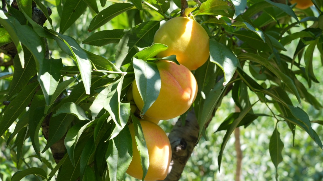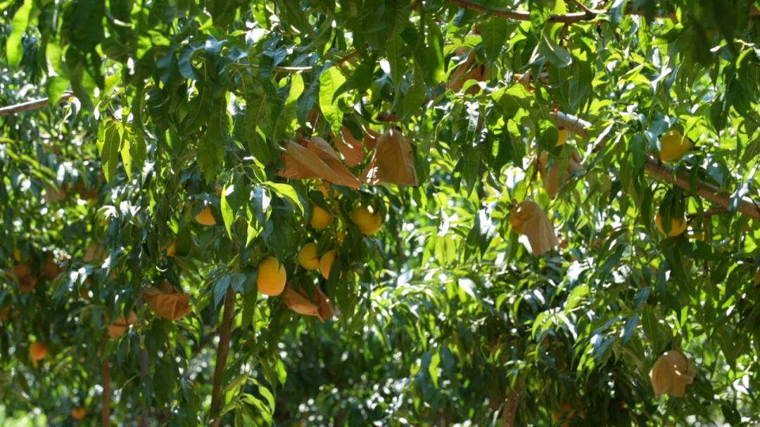 细看果园,沉甸甸的黄桃都被黄色的保护袋严密包裹。打开袋子,只见果实个个饱满圆润,金黄的色泽十分诱人。这种生态种植方式正是基地的特色。