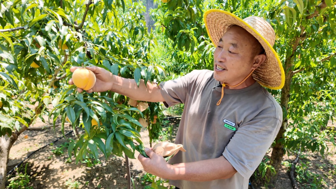 冯秀华的转型之路颇具故事性。2020年,为响应河道生态整治号召,他毅然关闭了经营多年的砂场。经过深入的市场调研,他于2021年投身桃树种植产业。种植桃树既能修复裸露土地,也开拓了一条可持续发展之路。秉持“干一行、钻一行”的精神,冯秀华多次前往河南、襄阳等地考察学习,并通过线上课程钻研种植技术,持续提升果园管理能力。