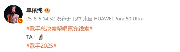 此前,单依纯发微博透露帮唱嘉宾线索。